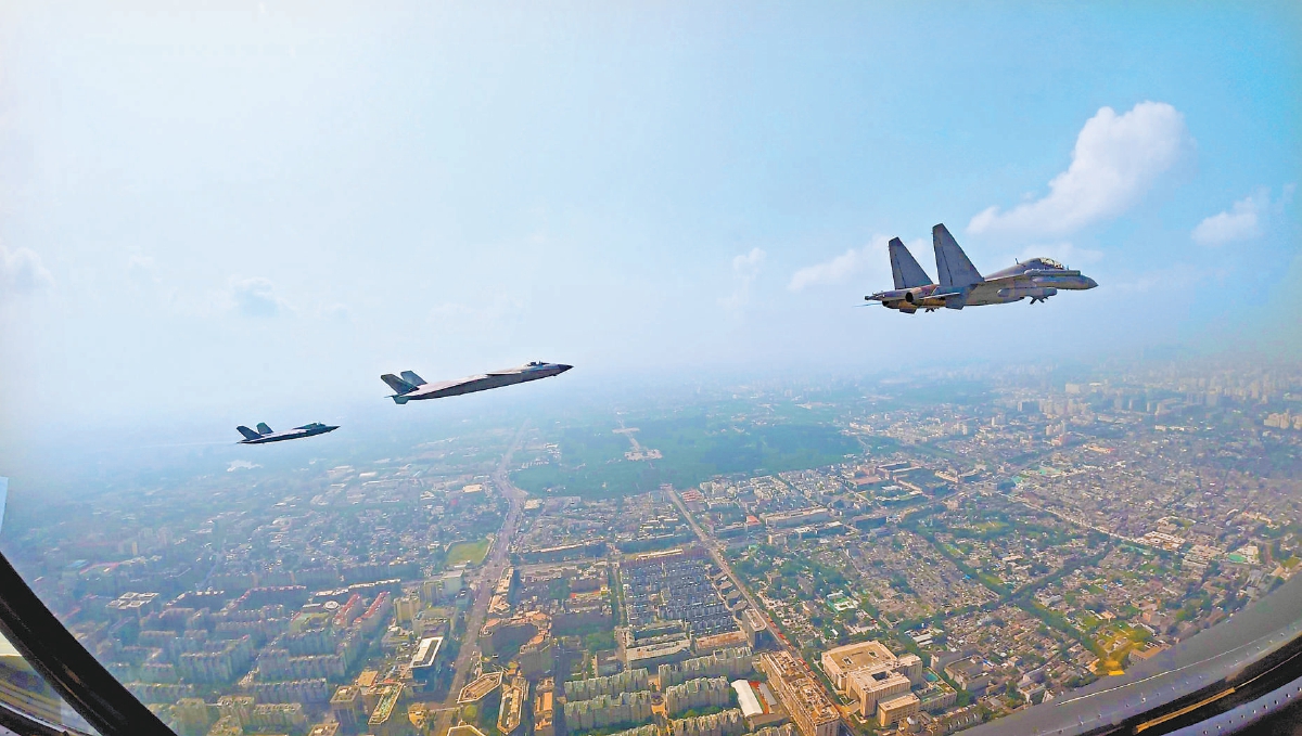 战鹰呼啸,振翅长空。预警指挥机、特种机、运输机、轰炸机、加受油机、歼击机、舰载机等空中梯队依次低空飞过天安门广场。这是歼击机梯队从北京城区上空飞过。 新华社发
