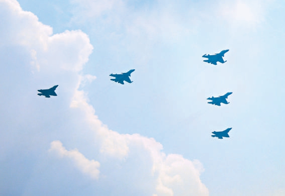 歼击机梯队飞行员熟练操控飞机接受检阅。 新华社发