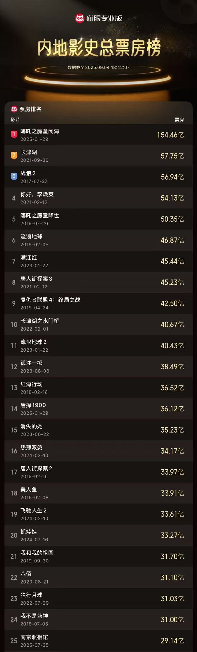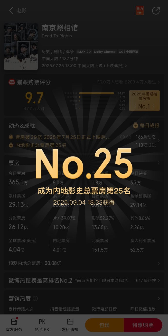 《南京照相馆》进入影史票房榜前25