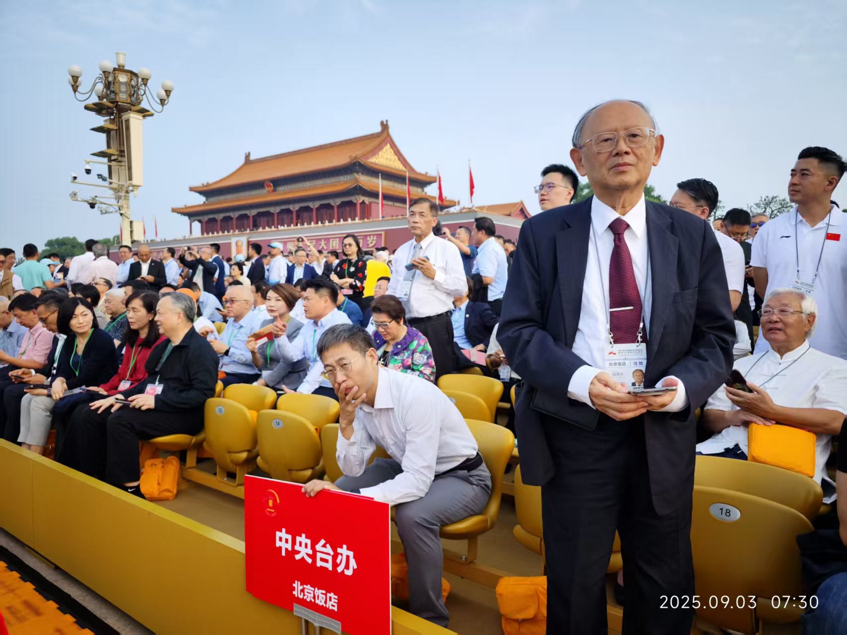 9月3日,《祖国》杂志社社长、统一联盟党荣誉主席戚嘉林受邀在天安门广场观礼阅兵。