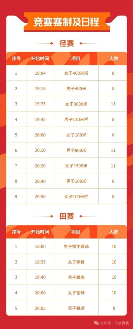 本站赛事设男子、女子各7个项目比赛,包括男子100米、400米、800米、110米栏、撑竿跳高、跳高和跳远;女子100米、1500米、3000米、100米栏、400米栏、铅球和标枪。选手们力争在北京创造理想成绩。