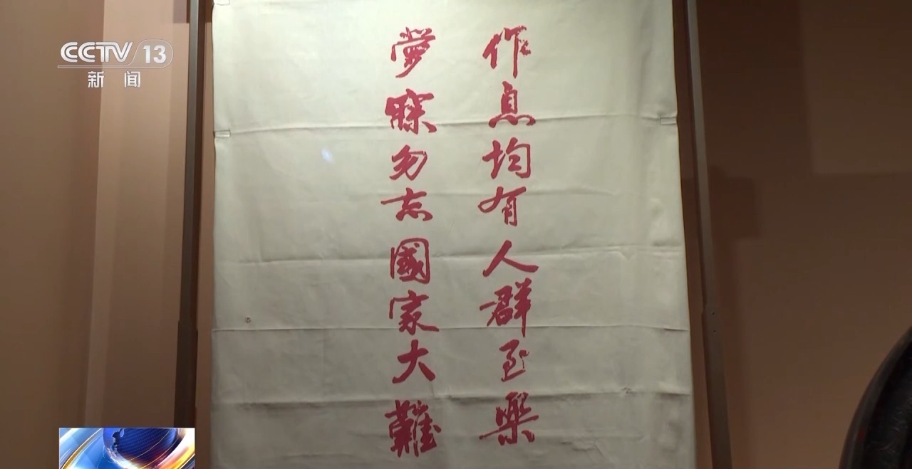 在另一个展柜当中,还有一块特别大的布料,上面写着两行红字:“作息均有人群至乐,梦寐勿忘国家大难。”其实它是一个床单。