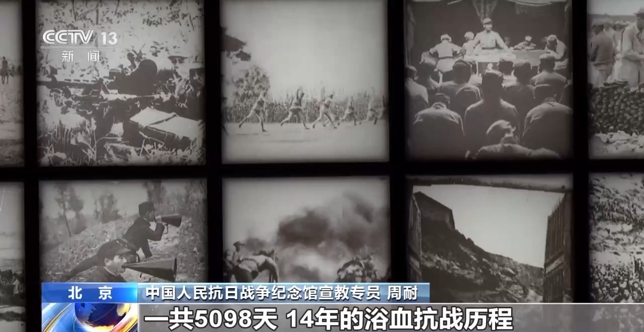 中国人民抗日战争纪念馆宣教专员 周耐:5098是指四亿五千万的中国人民从1931年9月18日,一直到1945年的9月2日,一共5098天,14年浴血抗战历程。照片墙上有军人在战场上骁勇奋战的场景,还有少年儿童,有青年知识分子,以及妇女。那个时候不分阶级党派,不分男女老幼,不分民族宗教,大家同舟共济投入抗日救亡的神圣事业当中。所以我们中国人民抗日战争的胜利是由无数正义的仁人志士共御外侮,才迎来最终的胜利。