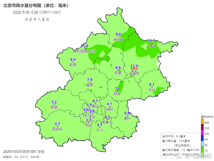 5日09时至16时,全市平均降水量6.1毫米,城区平均4.5毫米;最近一小时(15-16时)最大降水量在怀柔下庄7.1毫米。