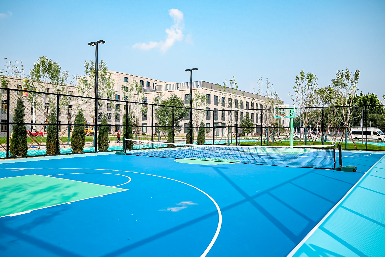 从新校区的北门走进校园,门前的褐色中山装雕塑十分醒目,它与北服朝阳樱花园校区的雕塑一脉相承,以相同的设计语言串联起北服人的共同记忆,成为新校区的文化标识。校园里,崭新的教学楼、新建的运动场以及充满设计感的艺术涂鸦,处处洋溢着青春与活力的气息。