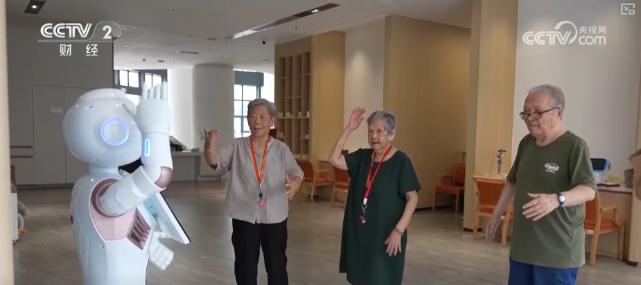 而在这家养老院的活动室里,一台娱乐机器人正跟随音乐节拍挥舞着双手,带领几位老人一起跳舞。