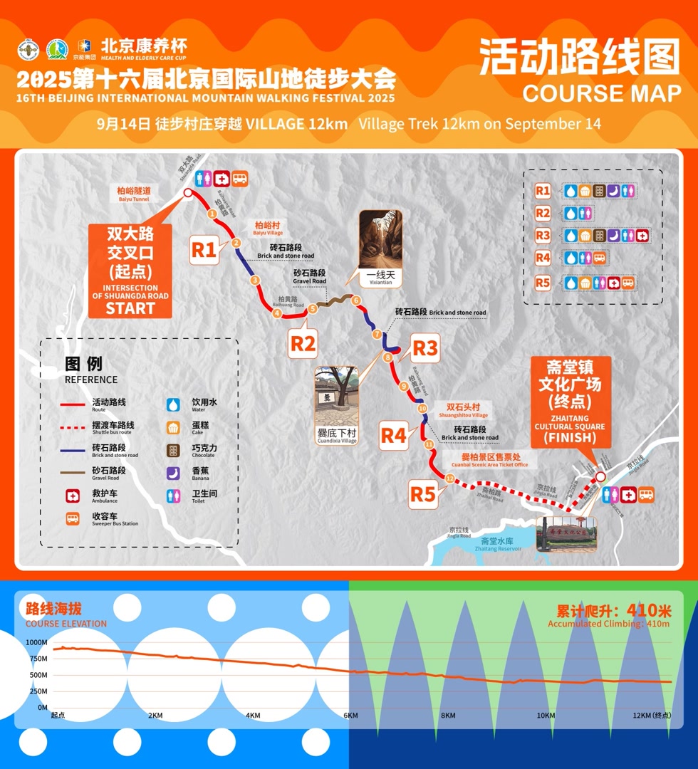 本次徒步大会以“徒步京西,乐享四季”为主题,设置了生态挑战20公里/10公里、村庄穿越20公里/12公里,以及徒步之星(连续两天完成20公里)共5个组别,在视觉系统、运营创新、组织保障等方面全面升级。在终点处斋堂镇文化广场,组委会设置了美食区、展区、展演区以及具有属地特色的市集摊位,预计吸引超2万人次参与。