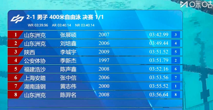 5月刚满18岁的张展硕是首个比赛日发挥最好的选手。在晚间进行的男子400米自由泳决赛中,张展硕以3分42秒99的成绩一骑绝尘。夺得本届比赛首金的同时,刷新个人最佳成绩和世界青年纪录。此外,张展硕的成绩仅次于孙杨(3分40秒14)、张琳(3分41秒35)两名前辈,是男子400米自由泳项目上全国历史第三快。