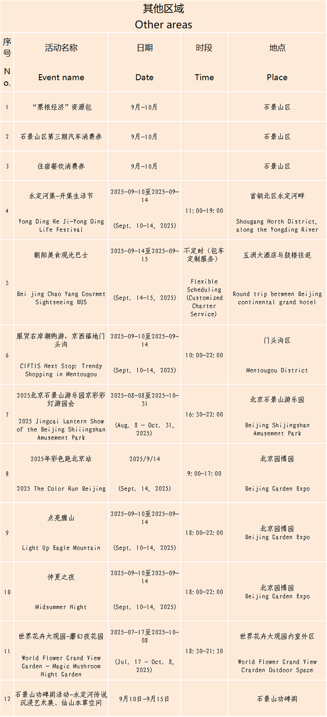 精彩旅游方面,举办“服贸会我来了”文旅嘉年华,涵盖多项文商旅体科融合活动。在首钢园草坪举办露营&艺术生活荟、文博生活创享荟等活动。在世界花卉大观园举办“蘑幻夜花园”活动。