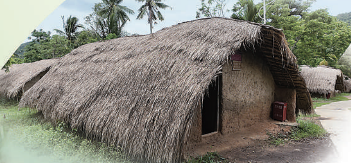 漫步村庄内,椰树与三角梅相伴的村道旁,一间间房屋错落有致。因茅草覆顶,屋檐接地,檐墙合一,形似船底,这些屋子得名“船型屋”。