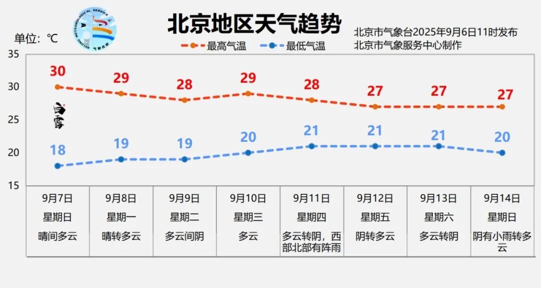 下周,受高空偏西气流控制,大部分时间云量较多,最高气温呈现缓慢下落的趋势。早晚天气舒适,风也带着几分清爽,不管是晨跑还是傍晚骑行,都有一份夏末特有惬意。不过年老体弱人群早晚出行可以带件薄外套,以免着凉感冒。