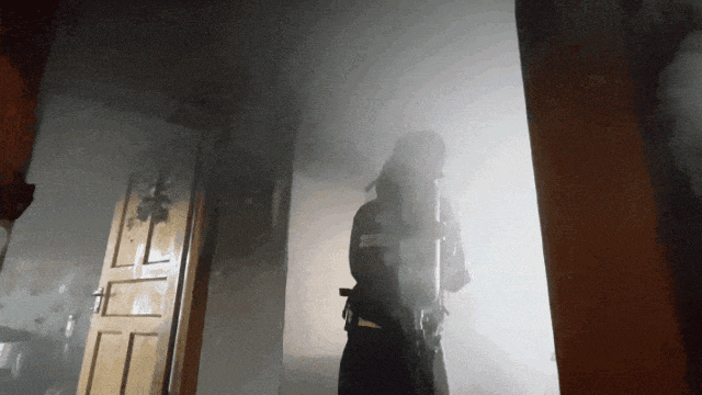 用水枪将屋内火势扑灭