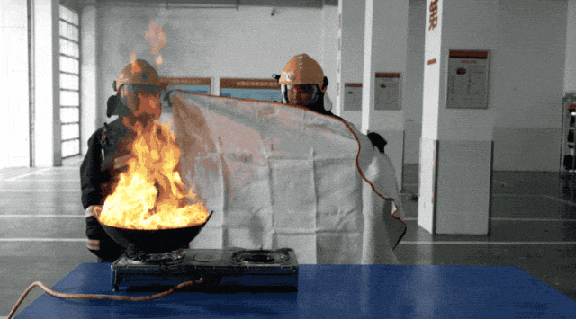 消防员将面积大于锅盖的灭火毯展开