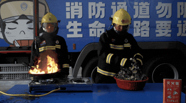 消防员将瓶装水倒入油锅