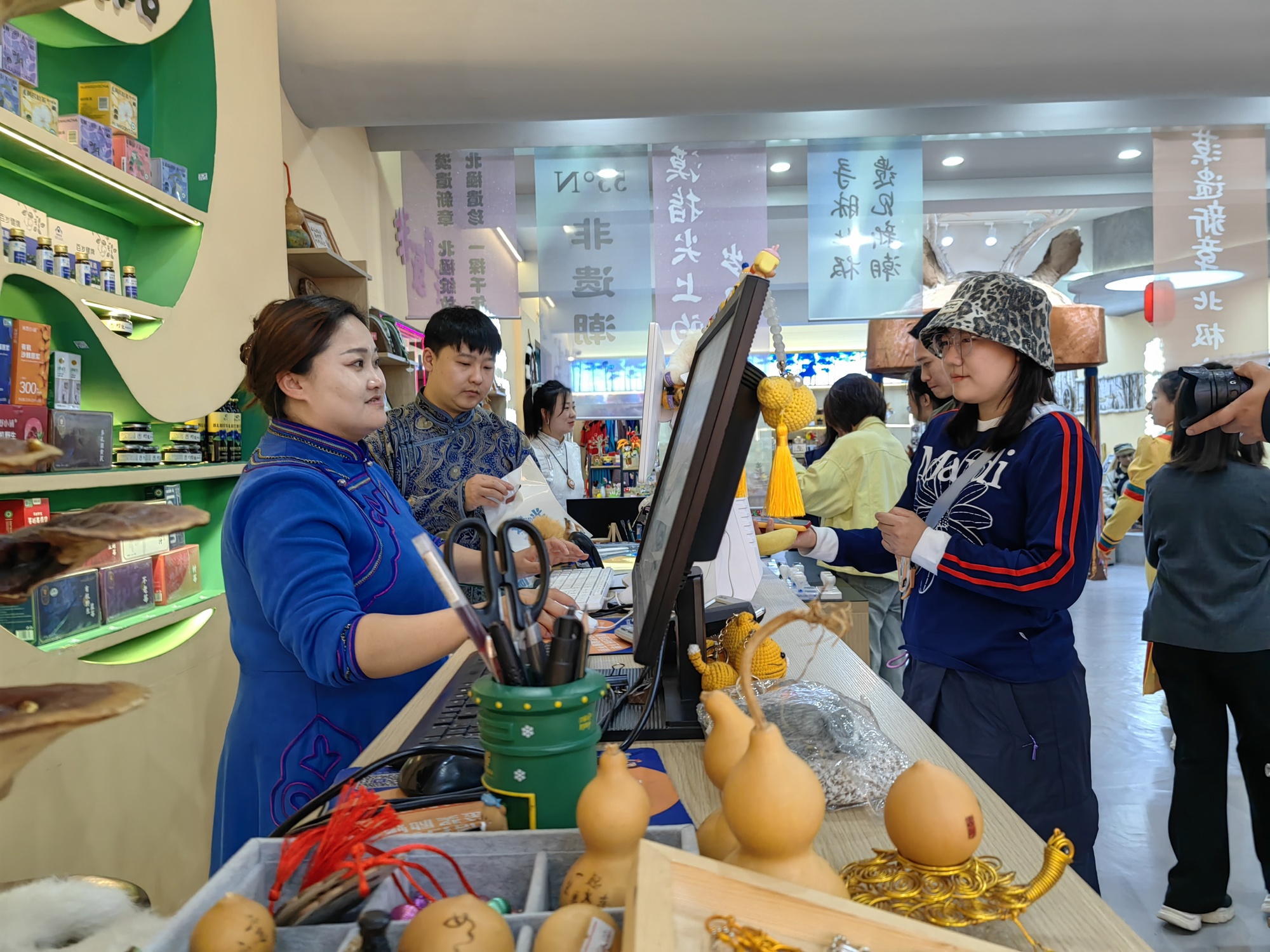 走进今年6月开业的漠河非遗文创体验馆,一个个色彩鲜亮、纹路精巧的树皮盒、造型独特的兽角帽、栩栩如生的树皮粘贴画琳琅满目,这些凝聚着鄂伦春人智慧的手工艺品,成了游客争相购买的漠河好物。桦树皮做的冰箱贴、兽皮刺绣钥匙链、印着鄂伦春图腾的帆布包也深受游客喜爱。在北极村旅游景区,龙粤“漠河礼物”文创中心中的主要文创产品,也都带着大森林的味道。
