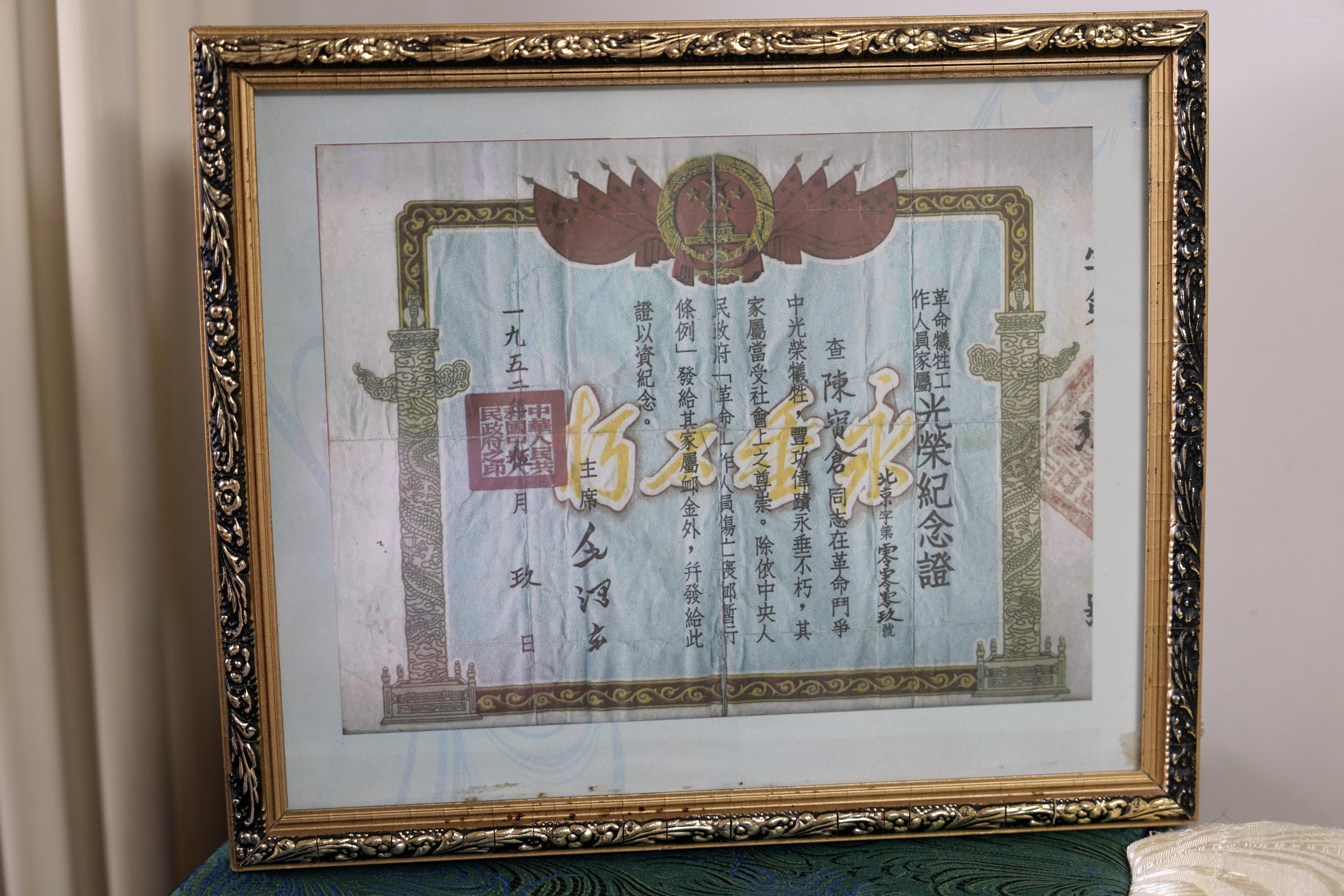 李敏家的客厅里,一张《革命牺牲工作人员家属光荣纪念证》静静陈列,光荣证的签署人是毛泽东,编号0009。“这是党中央对外祖父隐蔽战线身份的最高认可。”李敏说,1953年9月,陈宝仓的骨灰在八宝山革命公墓安葬。