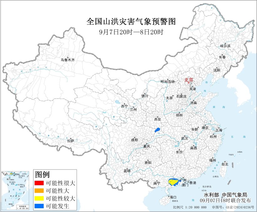 预计,9月7日20时至8日20时,广东西部、广西东部、四川东北部、重庆北部、陕西东南部等地部分地区可能发生山洪灾害(蓝色预警),其中,广东西部、广西东部等地局部地区发生山洪灾害可能性较大(黄色预警)。其他地区也可能因局地短历时强降水引发山洪灾害,请各地注意做好实时监测、防汛预警和转移避险等防范工作。