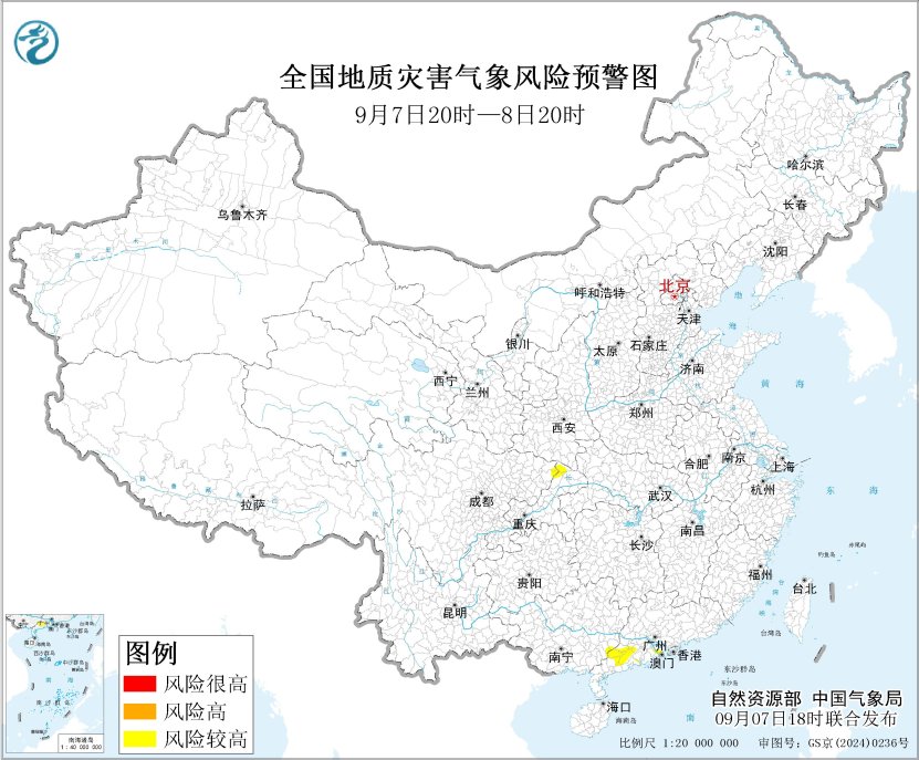 自然资源部与中国气象局9月7日18时联合发布地质灾害气象风险预警: