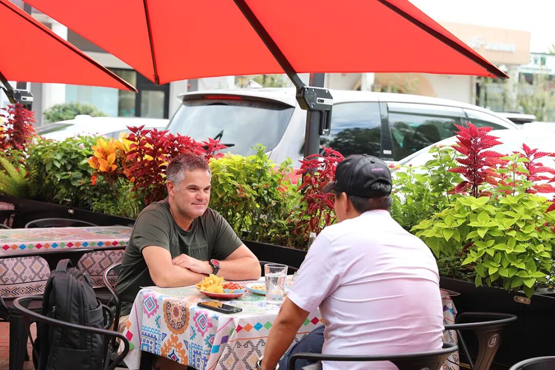 烈马墨西哥餐厅总经理陈永生介绍:“我们特意在外摆区融入南美元素,餐桌上铺着色彩鲜艳的印花桌布,花池里迷迭香、百里香与墨西哥小彩椒自在生长,浓郁的南美风情扑面而来。”每当有国内外大型赛事,餐厅还会在室外进行直播,让中外居民围坐在一起,共享热闹的观赛氛围。
