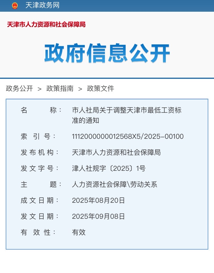 今日,天津市人社局发布关于调整天津市最低工资标准的通知,全文如下↓
