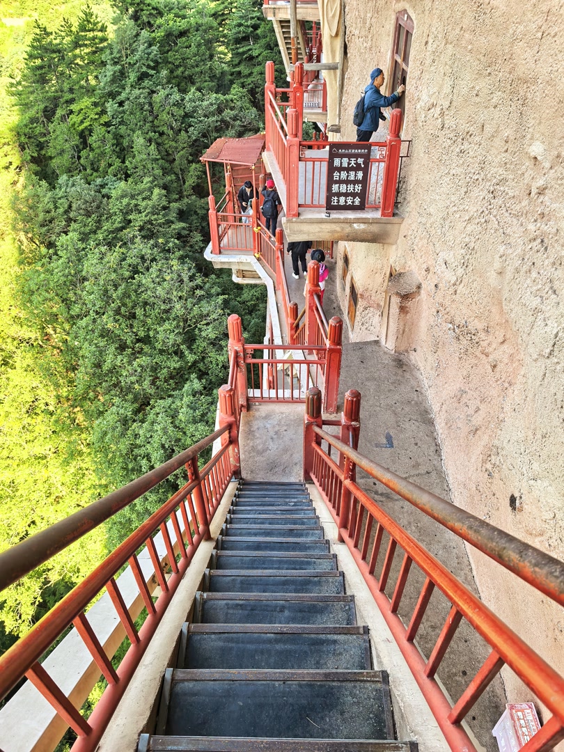 我沿着凌空架设的栈道拾级而上。这些栈道本身就是奇迹,与甘南那些天然形成的山路不同,这里的每一寸道路都凝聚着古人的智慧和汗水。古人曾称赞这些工程:“峭壁之间,镌石成佛,万龛千窟。碎自人力,疑是神功。”