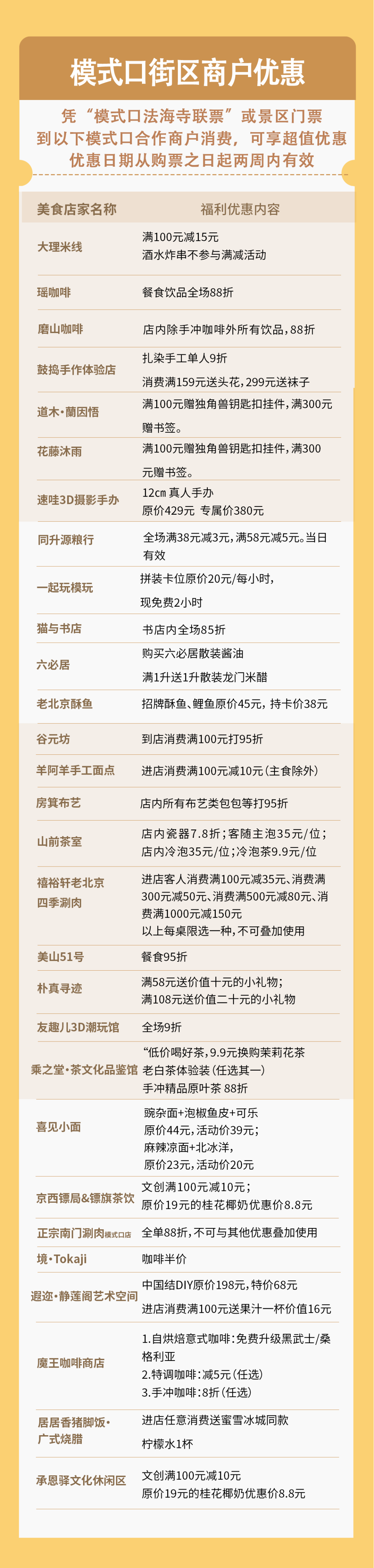 这种 “凭票享优惠” 的明确机制,让 “票根” 成为连接文化与商业的纽带,既有效拉动消费,更有力推动文商旅融合发展,持续擦亮模式口的文化底色,激发街区活力,让每一位来访者沉浸式感受京西历史与当代生活的交融魅力。金秋时节,诚邀您手持“模式口法海寺联票”,在模式口开启一段融合古今、贯通虚实的文化发现之旅。