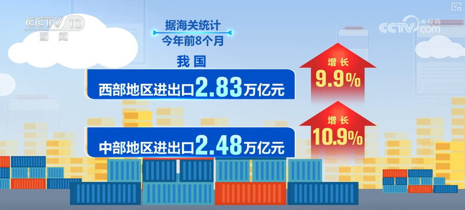 据海关统计,2025年前8个月,我国西部地区进出口2.83万亿元,增长9.9%;中部地区进出口2.48万亿元,增长10.9%。