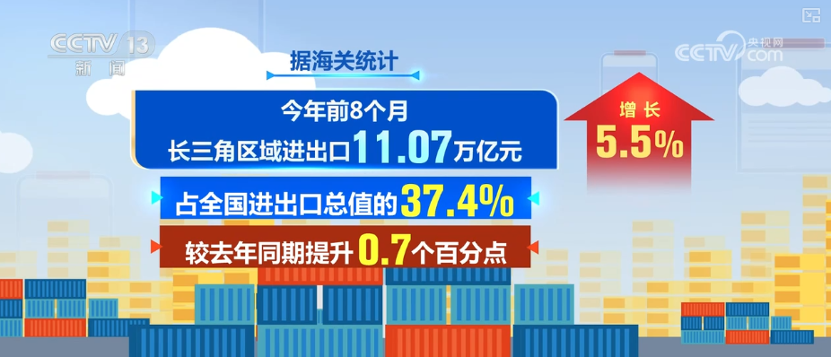 吕大良介绍,近年来,长三角区域创新能力、发展能级不断提升,为外贸高质量发展注入强劲动能。2025年前8个月,长三角区域进出口超过11万亿元,对全国进出口增长的贡献率达到58%。
