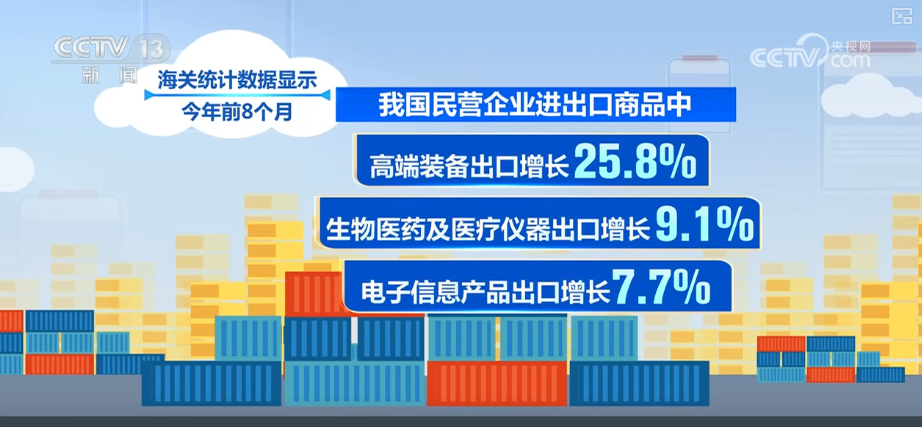 海关统计数据显示,2025年前8个月,我国民营企业进出口商品中,高端装备、生物医药及医疗仪器、电子信息产品出口分别增长25.8%、9.1%、7.7%。