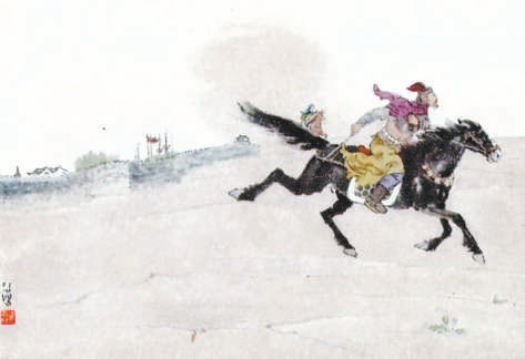 第二幅插图为横幅,内容应是薛平贵投军。画面中,薛平贵纵马向右疾驰,与身后的城墙呈渐行渐远的开张之势。中国艺术研究院美术研究所研究员华天雪认为,该作有两点最值得注意。其一,徐悲鸿画马通常只画马,很少画带关系的人和马,像这样疾驰状态中的人马关系,像这样关联状态中的准确造型,都是徐悲鸿作品中极少见的。其二,这匹侧身奔跑的黑色坐骑,精细程度也为徐悲鸿画马中所仅见,很少有像这样从笼头、缰绳、铃铛到马鞍、马镫,装配得如此齐全且刻画得如此工致的;徐悲鸿的马鬃、马尾大多以大笔扫出,很少像这样以线为主的。这匹马堪称徐悲鸿画马范本,而且是水平很高的范本。