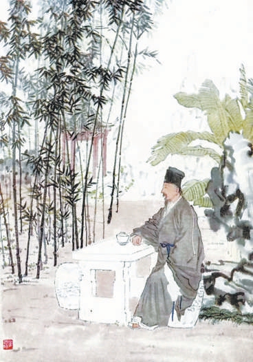 第三幅插图《赏雪》,亦被用于封面。画面中央,“王允坐在相府花园内的石桌边品茗赏雪,周围是翠竹、芭蕉、湖石”,但似乎“雪”意并不明显,设色倒更似春天。与前两幅不同,此图情节较为平淡,人物性格特征也不突出,因此,徐悲鸿着力于营造丰富的背景环境,所动用的笔墨方法也更为多样,更接近传统中国画的样式。成片的竹林、多姿的芭蕉、粗笔写意的湖石和白描的桌凳,在徐悲鸿画作中,这种表现古代士人优游生活的主题极为罕见。