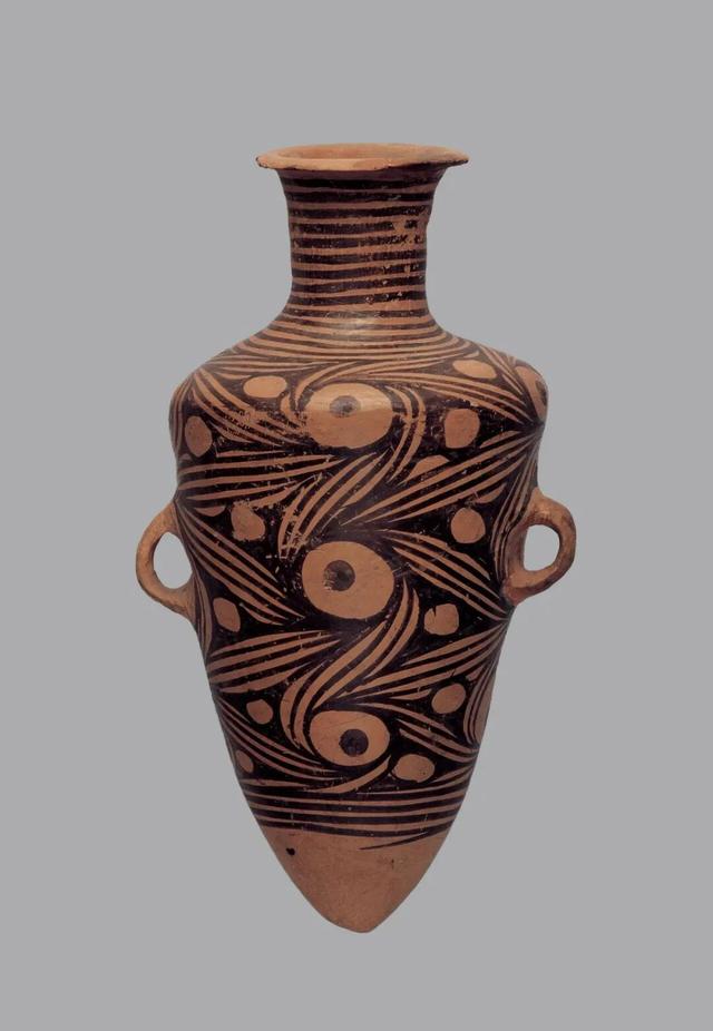该器施黑彩,颈部绘平行弦纹,肩部以下绘三组连续旋涡纹。小口尖底瓶是仰韶时代的典型器物,漩涡纹是马家窑文化的标准纹饰,两个时代特征的融合,体现了后世对前代文化的一种追忆。这件小口尖底瓶器形不大,纹饰却比同时代同等大小彩陶器的装饰图案要繁缛、华美,表明这件器物不是日常生活用品,可能具有某种礼仪性的功用。