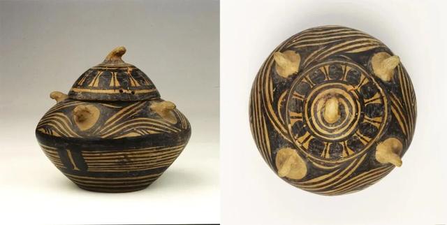 陶罐口沿外饰四鋬,器物整体线条简洁疏朗,粗线条分隔着每组不同的细线条组合,横竖运用得当。马家窑彩陶中带盖的器物少见,因而更显珍贵。