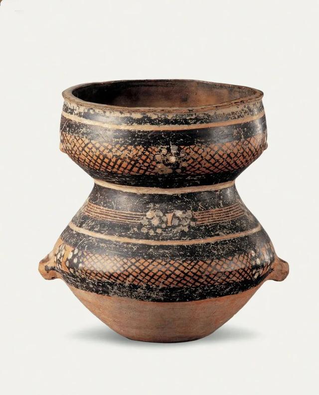 该器以黑彩绘旋纹,间饰网纹,以白彩绘多组圆点花瓣。束腰造型在同期陶器中较为罕见,展现了马家窑类型陶器的工艺创新。旋纹、网纹与花瓣纹的组合纹饰,反映了先民对自然元素的抽象化表达。