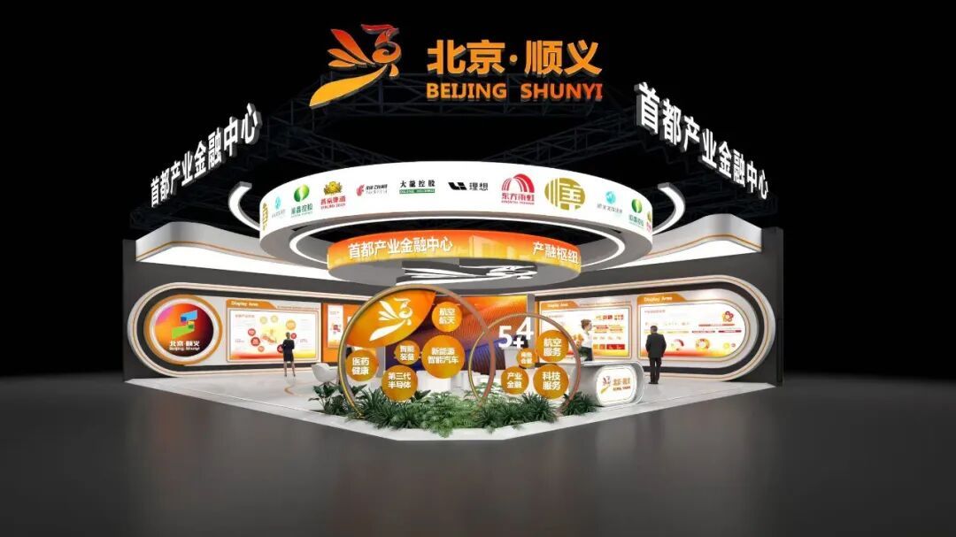 金融服务专题展顺义区展位位于首钢园6号馆,总面积为246.5平方米,以“产融枢纽 链接未来”为主题,深度融入“产业与金融融合共生”的设计理念,将顺义“5+4”主导产业的蓬勃活力与金融赋能的强劲动能紧密串联,彰显顺义作为北京市经济大区和制造业强区的良好形象。展区整体采用橙红、金黄渐变色调,象征着金融资本的繁荣活力。顶部悬挂的“腾飞的金丝雀”尤为夺目,昭示顺义金融顺势而为、乘势而上、振翅高飞。