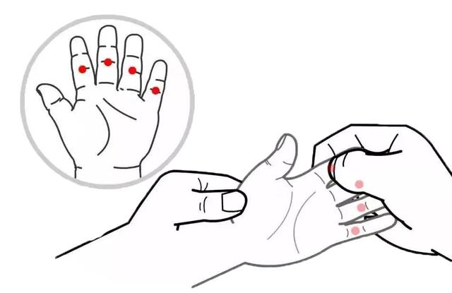② 掐揉四横纹:从食指纹起每捻揉3-5次后,以拇指指甲掐1次,依次捻掐完四指为1遍,操作10遍。