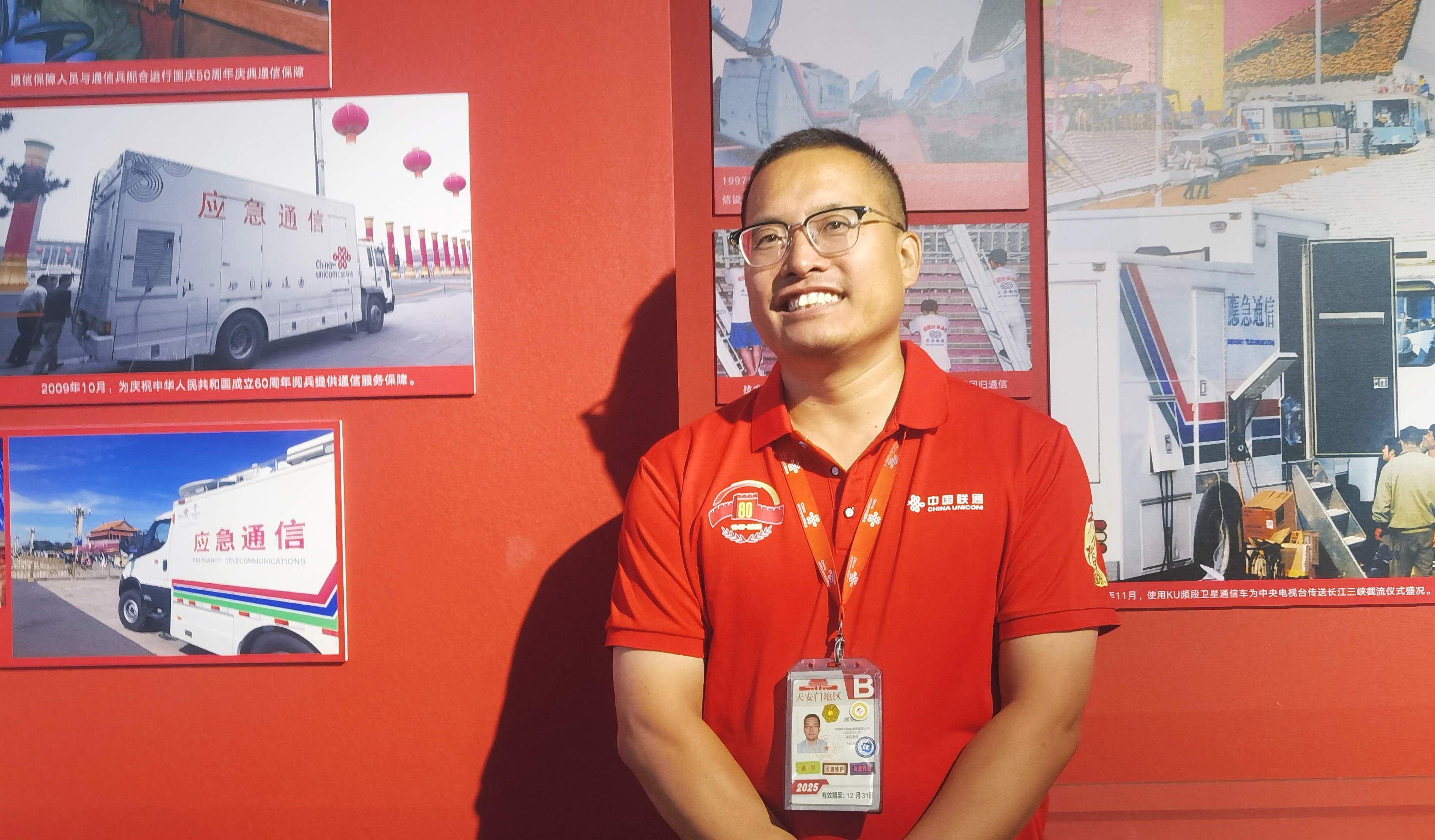 今年九三阅兵提供通信保障的天安门城楼区负责人郝海波 ,当天他的岗位就在天安门城楼国旗杆附近。