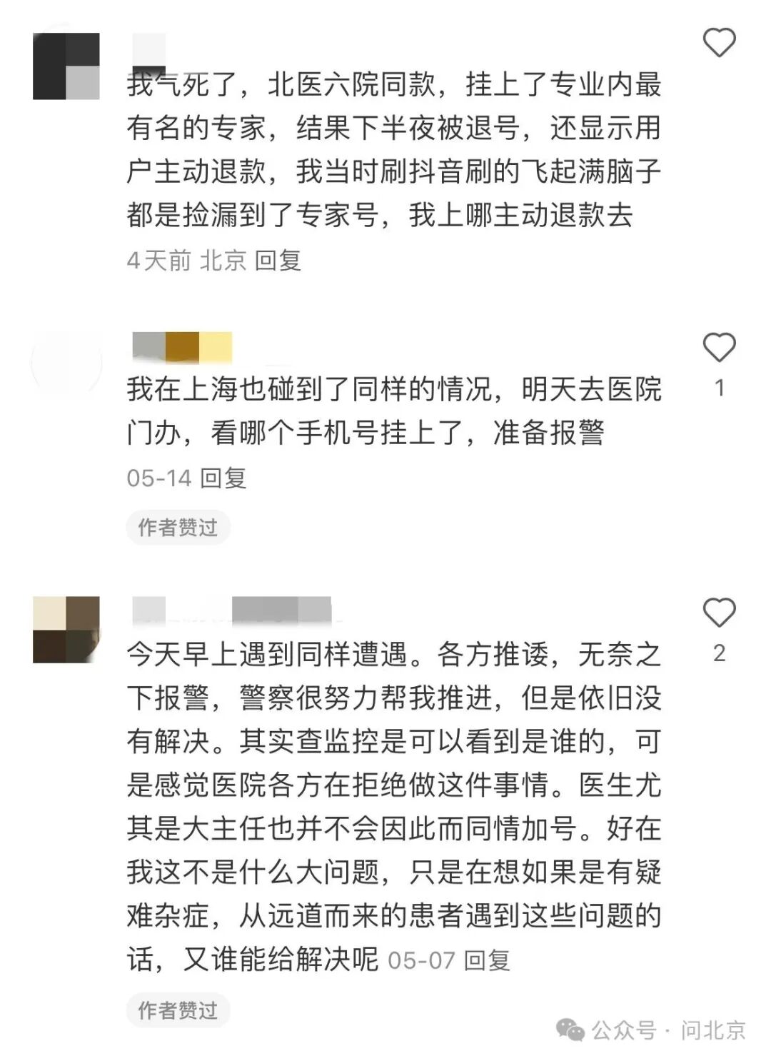 “问北京”记者查询社交平台发现,“被退号” 的情况并非北大六院个例,其他医院也有患者反映类似问题。目前,“问北京”记者已将相关情况反馈给北京市卫生健康委员会,呼吁主管部门重视此事,从系统安全与挂号机制层面进行优化,杜绝此类事件再次发生。