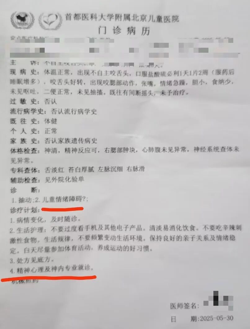 今年上半年,张先生的孩子出现频繁咬舌等无法自主控制的行为,“心情不好就直接咬,舌头咬烂了会吐血,他真的不是故意的,完全不受控制。” 张先生的话语里满是心疼。他带着孩子在天津当地及北京多家专科医院辗转问诊,可孩子的症状始终没有缓解。