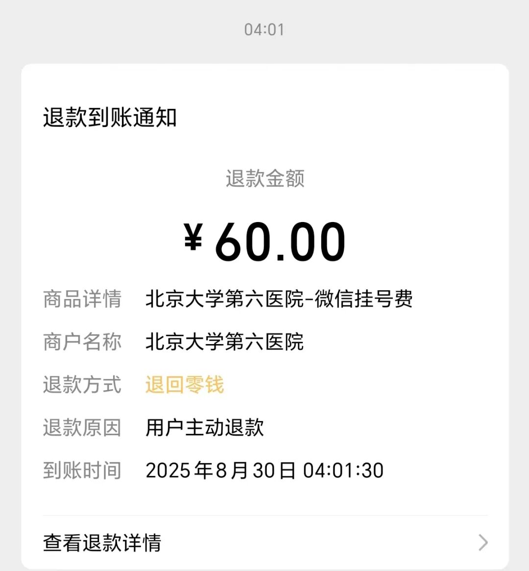 可这份喜悦并未持续太久,希望在一夜之间彻底翻转。8月30号清晨,张先生刚醒来就看到了一条让他如遭雷击的系统通知——他前一天挂上的号已被取消。更让他费解的是,微信支付界面显示的退款原因是 “用户主动退款”,操作时间标注为凌晨4点01分。张先生说那时一家人早已进入熟睡状态,“我早上第一眼看到这条信息,脑子瞬间就懵了。凌晨4点,谁会去退这个号?”明明已经到手的专家号,竟还能这样‘被取消’?