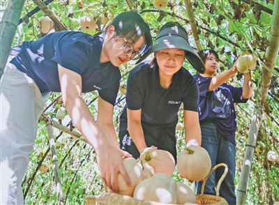 浙江安吉县黄浦江源片区的南希南农创基地里,青年职工们在采收可生食的拉飞南瓜。