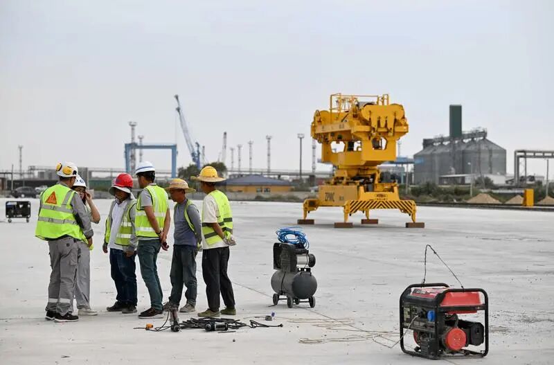 图为工人在哈萨克斯坦阿克套港集装箱枢纽一期工程工作。新华社记者 李任滋 摄