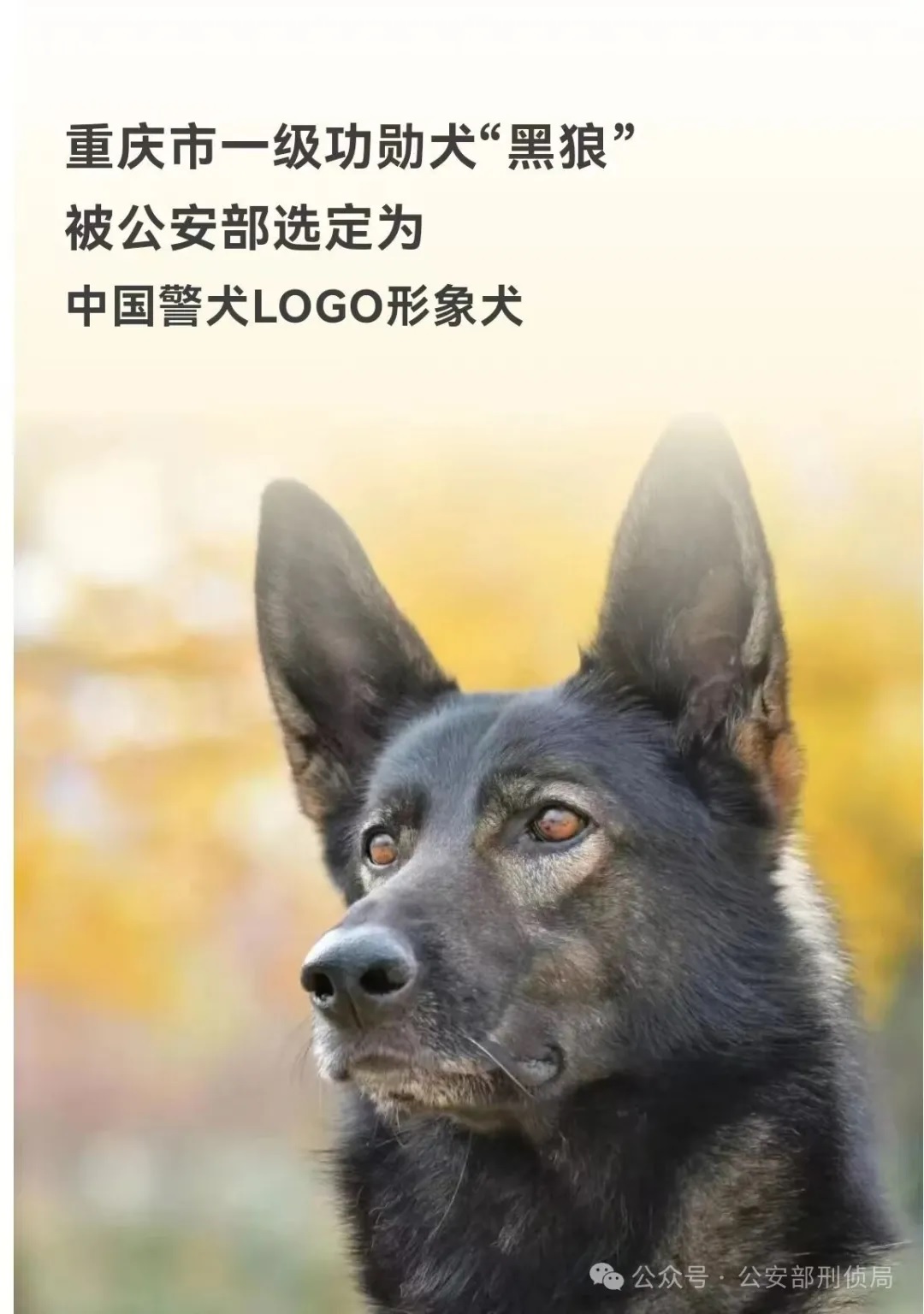 公安部刑侦局在研究设计中国警犬标识时,从“中国品牌犬、功勋犬、犬体形态好”等三个维度在全国在编警犬中甄选警犬头像,作为中国警犬标识的主要元素,重庆市警犬“黑狼”的形象照片经专家组综合评定满足甄选标准。