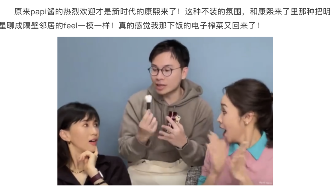 以创作搞笑视频闻名的初代网红papi酱开了一档明星访谈节目《热烈欢迎》,被誉为新时代的《康熙来了》。