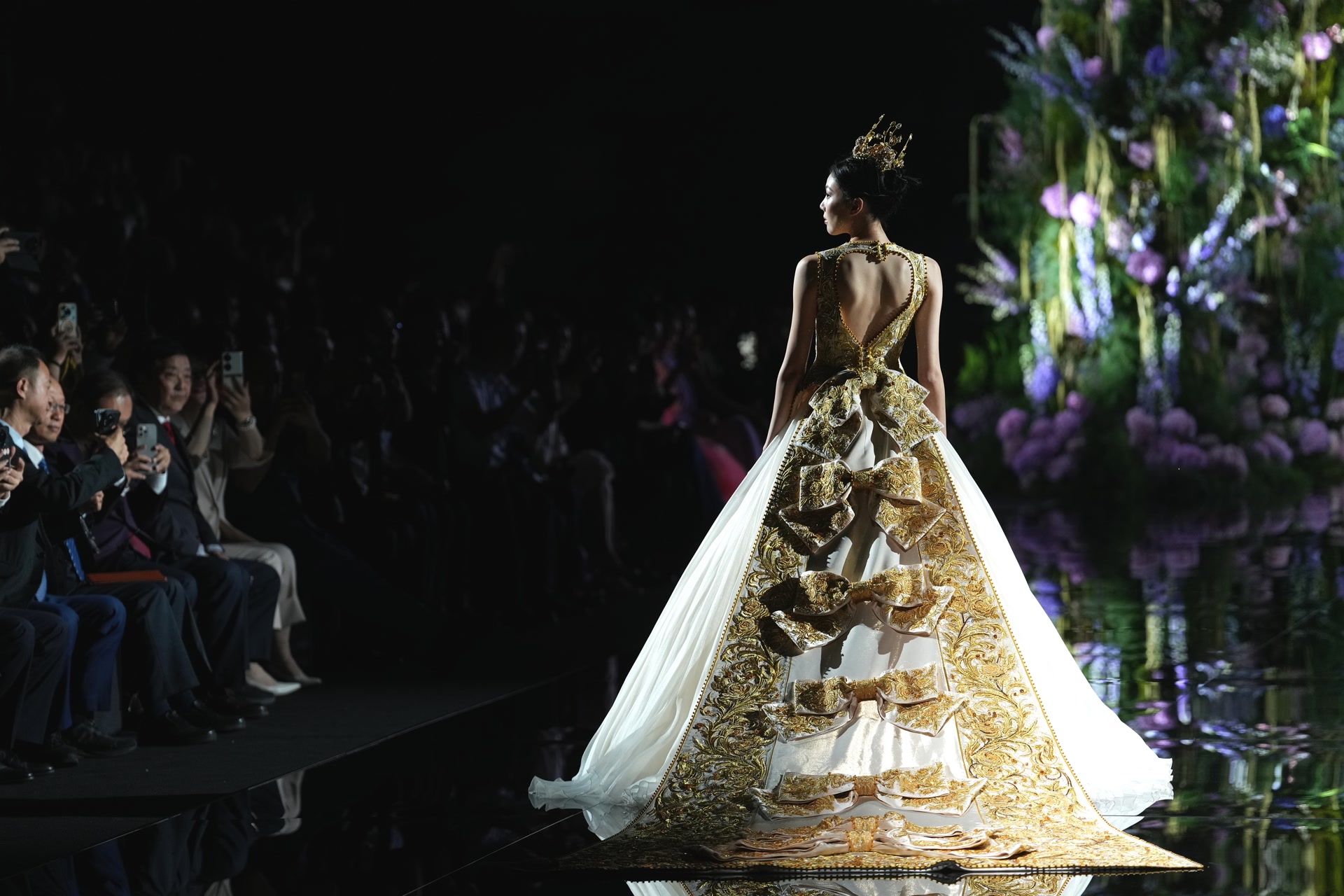 夜晚的国家会议中心二期,光影交织、时尚潮涌。在明星红毯环节,交互服务机器人与明星同台亮相,实现科技与时尚的跨界对话。开幕当晚,国际知名高定设计师郭培以“鎏光”为主题,带来一场高定大秀。鎏金元素与东方纹样在光影间交错生辉,诠释东方美学与当代时尚的融合新生,在场观众也沉浸于中国设计与世界潮流的深度对话。