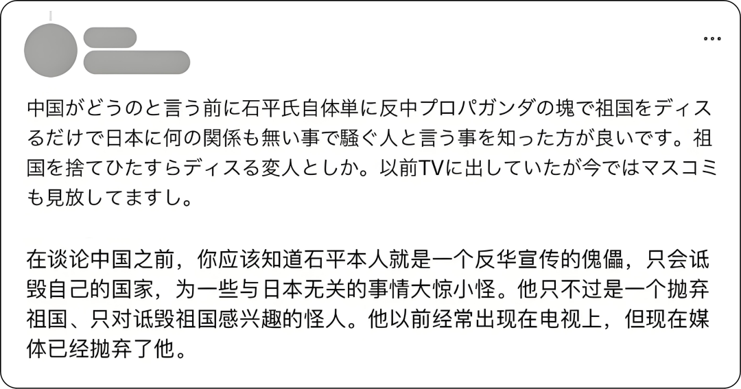 这次的反制对象石平,原是中国人,26岁赴日留学,45岁转为日本国籍。在此之后,几乎在所有涉及中日关系的敏感议题上,他都罔顾事实: