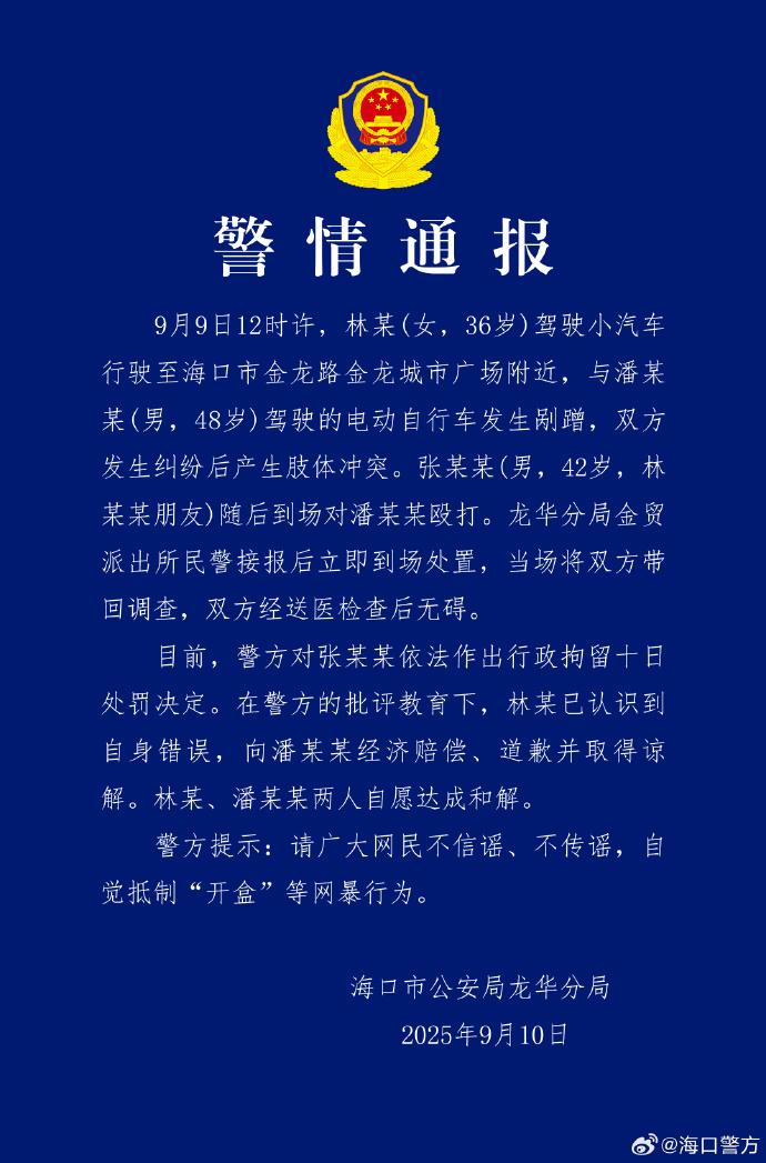 海南省海口市公安局官方微博9月10日晚发布警情通报:
