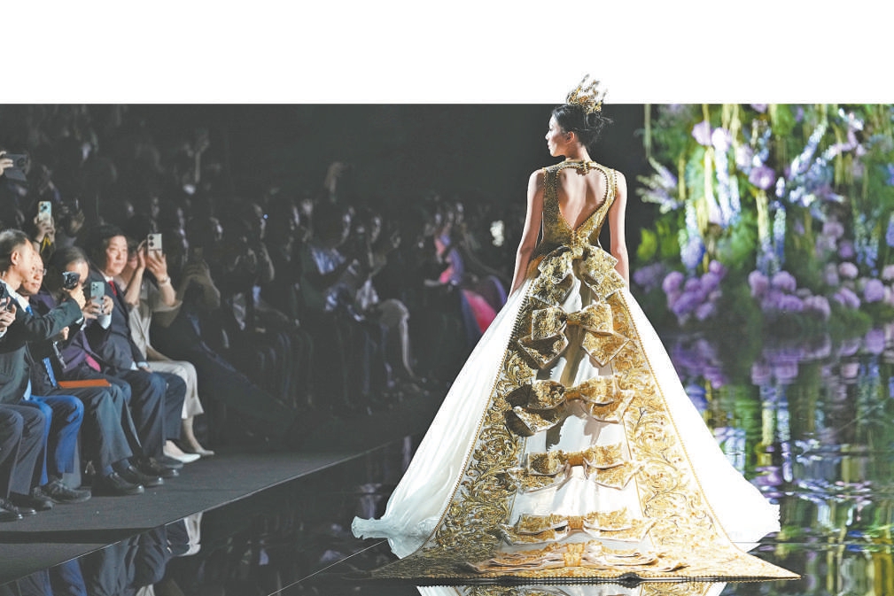 夜晚的国家会议中心二期,光影交织、时尚潮涌。在明星红毯环节,交互服务机器人与明星同台亮相,实现科技与时尚的跨界对话。开幕当晚,国际知名高定设计师郭培以“鎏光”为主题,带来一场高定大秀。鎏金元素与东方纹样在光影间交错生辉,诠释东方美学与当代时尚的融合新生。