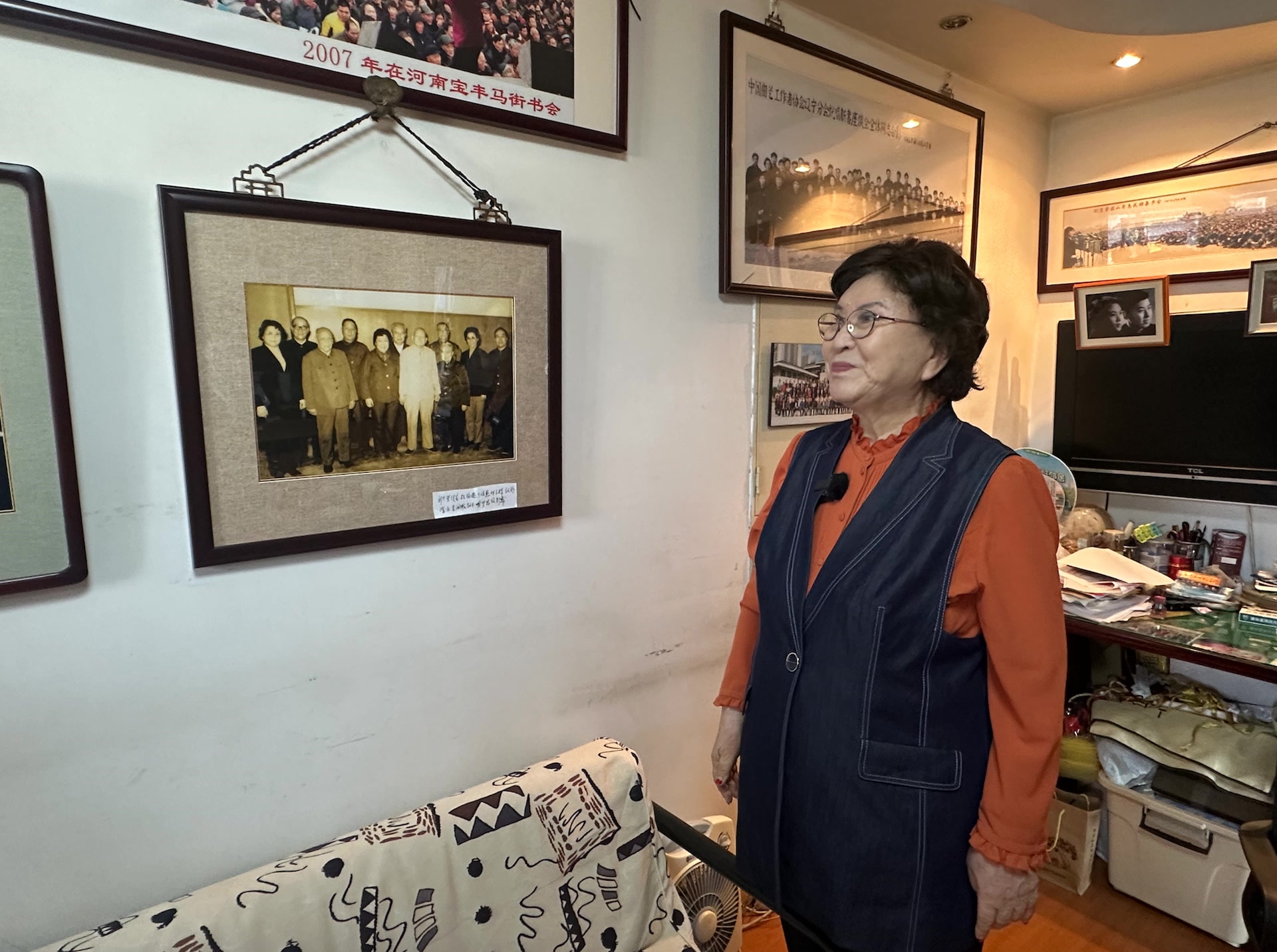 家中墙上挂着她到各地演出的照片,大横幅的广角镜头里,刘兰芳的身影只占一角,其余的画面都是成千上万津津有味听书的观众。“这张是1987年在山东胡集书会,摩托车上、房顶上、树上全是人。”“这是2007年在河南宝丰马街书会,我年年都去,已经去了29次了!”