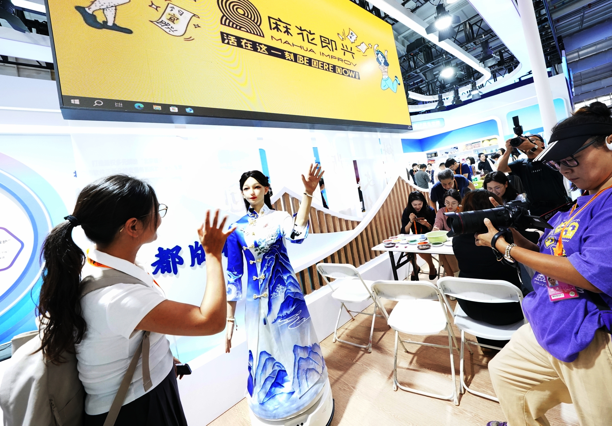 9月10日,2025年服贸会启幕。位于北京首钢园9号馆的首都版权展区内,身着新中式服装的机器人“版版”正在静候观众的到来,她本事很大,可以带着逛展、互动解说,还能从易到难提供“版权知识小课堂”。